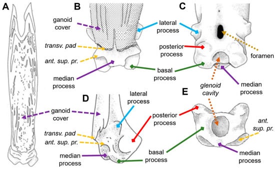 For instance, the shape of the head of the pinnule is used to define the genera Bartschichthys (inverse trapezoid head of the pinnule) and Sudania (wider than the high rectangular head of the pinnule), and also to distinguish certain species in each genus [Table 1]. The ganoin cover extension is also used to distinguish species among the genus Bartschichthys, and P. dageti is characterized by the presence of two ganoin plates with no ridges. S. grandis is defined based on an open glenoid cavity [Table 1]. Finally, the definition of most extinct genera and species includes a given degree of individualization of the processes [Table 1], which was found to be variable within the extant species P. bichir.
