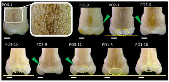 Microscopic images of the anterior view of different pinnules of different specimens of P. bichir. Each number corresponds to the respective position on the dorsal fin. Scale bars = 1 mm. The white rectangle zooms in on the ganoin ornamentation. The green triangle identifies different levels of concavity below the transversal pad. The yellow lines evidence various relative positions of the median process (dashed oval) compared to the base line of the pinnule (continuous line). Scale = 1 mm.