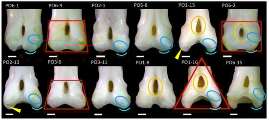 Microscopic images of the posterior view of different pinnules of different specimens of P. bichir. Each number corresponds to the respective position on the dorsal fin. Scale bars = 1 mm. The red polygons evidence the various shapes of the head in posterior view. The blue lines underline the various relative orientations of the posterior process (circle), and its position is more or less lateral compared to the basal process (cup). The yellow arrows point at shallow depressions between the basal and posterior processes. The orange oval underlines the foramen with different shapes. Scale = 1 mm.