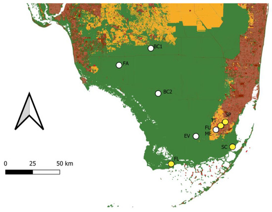 Land cover map of south Florida with general localities of known populations of Guzmania monostachia. White points are populations that are still present. Yellow points are populations that have been extirpated. Areas in green are natural lands. Areas in orange are agricultural lands. Areas in light red are rural areas. Areas in dark red are urbanized areas. Map constructed by using data from the Florida Cooperative Land Cover Map version 3.5. Population identifiers: Fakahatchee Strand (FA), Northern Big Cypress (BC1), Southern Big Cypress (BC2), Everglades (EV), Fuchs Hammock (FU), Meissner Hammock (ME), Flamingo (FL), South of Cutler (SC), Timms Hammock (TI), Silver Palm Hammock (SP).