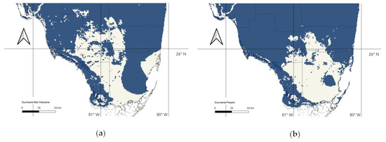 Representation of 90% thresholded species distribution models of Guzmania monostachia in Florida during the Mid-Holocene (a) and for the present day (b). Areas in blue represent areas that contain habitat which is at least 90% suitable.