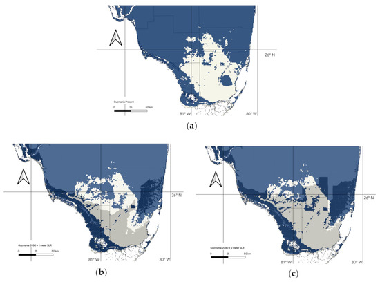 Representation of 90% thresholded species distribution models of Guzmania monostachia and sea level rise model in Florida for the present day (a), 2090 with 1 m of sea level rise (b), and 2090 with 2 m of sea level rise (c). Areas in blue represent areas that contain habitat which is at least 90% suitable. Areas submerged by 1 m sea level rise are represented by the overlying darker color (dark blue over suitable habitat).