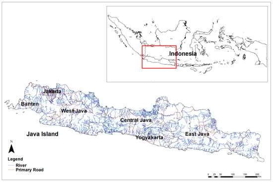 Java Island covers an area of 126,700 km2 and is divided into 6 provinces: Jakarta, West Java, Central Java, Yogyakarta, East Java, and Banten. Java Island is located between 7°50′10″ and 7°56′41″ South latitude and 113°48′10″ and 113°48′26″ East longitude. Java Island is bordered to the south by the Indian Ocean, to the north by the Java Sea, to the west by the Sunda Strait, and to the east by the Bali Strait (Figure 1).