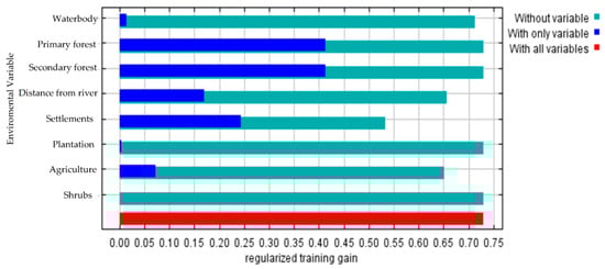 The environmental variables used in creating the model included the distance from rivers, primary forests, secondary forests, bodies of water, shrubs, agriculture, plantations, and settlements. The contribution of each environmental variable was assessed by looking at the percent contribution and permutation contribution and by looking at the results of the Jackknife analysis [31].