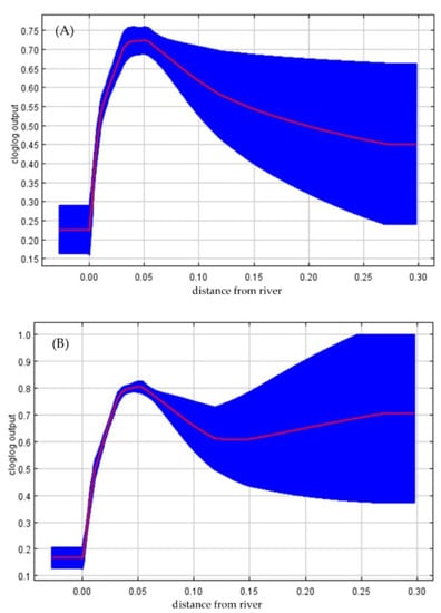 The response curve for the variable distance from the river (A) with other variables; (B) without other variables.
