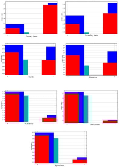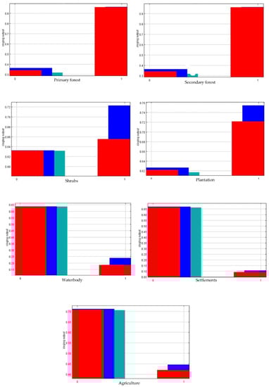 The relationship of land cover with the presence of the Javan leopard is shown in Figure 5 and Figure 6. In Figure 5 and Figure 6, the number 0 indicates not the selected variable, and the number 1 indicates the chosen variable.