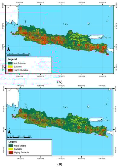 Javan leopard habitat suitability map: (A) 2000, (B) 2020.