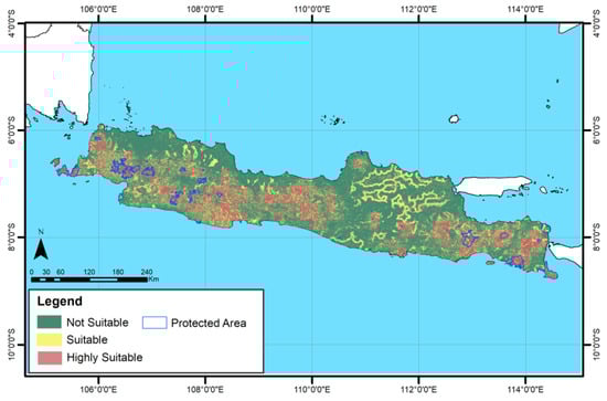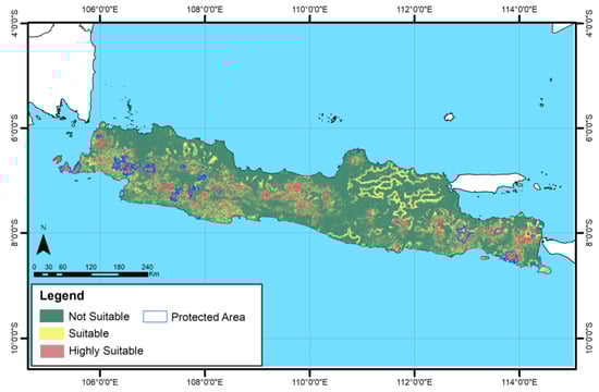 The unsuitable class of habitat on Java Island has the largest area. This is due to the destruction of forests, leading to the loss of habitat and habitat fragmentation, compounded by hunting for leopards and their prey animals. As the human population on the island of Java has increased, the conversion of land from forests to settlements has increased, reducing the forest area and leading to the isolation of the Javan leopard. The conservation area is an essential habitat for leopards. The quality of the forest in the conservation area has been maintained and has high biodiversity. In addition, the conservation area has a high level of protection from human activities that threaten the life of the Javan leopard.