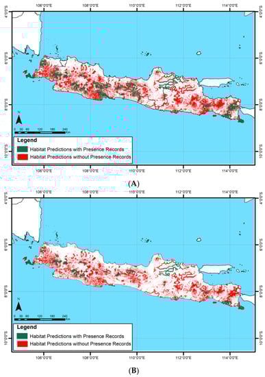 Javan leopard habitat suitability based on attendance records in (A) 2000 and (B) 2020.