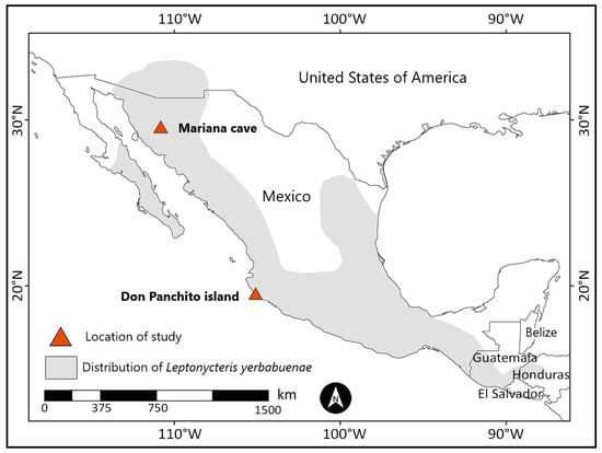 Geographical distribution of the lesser long-nosed bat (Leptonycteris yerbabuenae) [26], with sample collection sites in Mexico during 2019–2020.