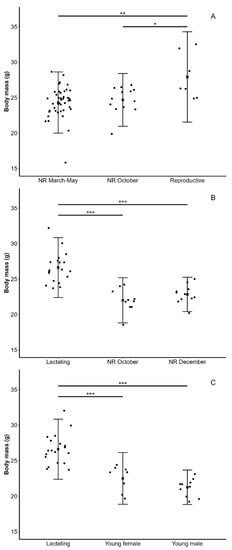 Body masses of lesser long-nosed bats (Leptonycteris yerbabuenae) for (A) non-reproductive (NR) adult males in March 2019 and 2020 and May 2019 (inguinal or scrotal testicles and no dorsal patches), October 2019 (scrotal testicles and no dorsal patches), and reproductive males in December 2019 (males with scrotal testicles and fresh dorsal patches) captured in west-central Mexico; for (B) lactating females captured in northern Mexico in May and July–August 2019 and adult females with no apparent signs of pregnancy or lactation (NR) captured in west-central Mexico in October and December 2019; and for (C) lactating females and young males and females captured in northern Mexico in July–August 2019. Pregnant females captured in northern Mexico were not included in the comparison because their body mass included the mass of the fetus. Values are means ± standard deviations. Significant differences in pairwise comparisons are shown (p ≤ 0.05 *, p ≤ 0.01 **, p ≤ 0.001 ***) based on a general linear model with a lognormal distribution.