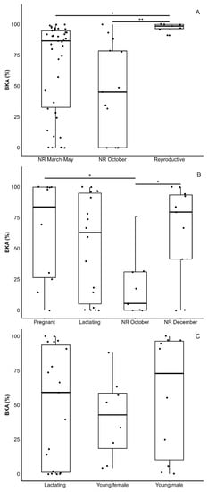 Bacteria-killing ability (BKA) in plasma of lesser long-nosed bats (Leptonycteris yerbabuenae) for (A) non-reproductive (NR) adult males in March 2019 and 2020 and May 2019 (inguinal or scrotal testicles and no dorsal patches), in October 2019 (scrotal testicles and no dorsal patches), and reproductive males in December 2019 (males with scrotal testicles and a fresh dorsal patches) captured in west-central Mexico; for (B) pregnant and lactating females captured in northern Mexico in May and July–August 2019 and adult females with no external signs of pregnancy or lactation (ANR) captured in west-central Mexico in October and December 2019; and for (C) lactating females and young males and females captured in northern Mexico in July–August 2019. Values are medians (squares), interquartile ranges (boxes), and 5–95% percentiles (whiskers). Significant differences in pairwise comparisons are shown (p ≤ 0.05 *, p ≤ 0.01 **) based on a generalized linear model with a zero-inflated beta distribution.