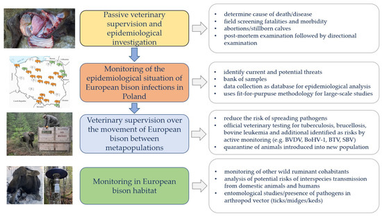 The European bison (Bison bonasus) is the largest land mammal in Europe, which was rescued from total extinction in the wild just after the First World War. This year, the anniversary of 100 years of restitution will be celebrated to commemorate the undertaking to start the recovery of the species from the remaining specimens scattered in enclosures throughout Europe. In addition to the limited gene pool (the species has been recovered only from 12 individuals, including only seven as founders of the Lowland line—LB), the main threats to the species involve epidemiological threats. As the Polish population has reached close to 2500 individuals, which is over one fourth of the Bison bonasus world population [1] and its status has changed to ‘Near Threatened’ on the IUCN Red List [2], conservation and management should be reconsidered to face new challenges, which aim to protect the whole population, not just individuals. In the last few years, the total population size of free-living European bison in Poland has increased significantly (Table S1, Figure S1). Additionally, the overall number of European bison kept in captivity is decreasing (Table S1, Figure S2), in favour of the establishment of new free-living subpopulations. The average population growth of European bison is approx. 7.5% per year; however, some free-living populations, such as the Bieszczady and Zachodniopomorskie herds, has doubled or increased by 85%, respectively, in the last seven years (Table S1). The historical documentation prepared by Dr. Wróblewski on the health threats of the European bison in the last remaining population in the Białowieska Forest at the beginning of the XIX century included common diseases transmitted from cattle [3]. One hundred and ten years later, the number of European bison inhabiting the Polish partof Białowieska Forest reached the former population size (Table S1) [4] (pp. 92–93). Under field observations and analysis of current infectious threats to European bison, a continuous surveillance has been performed by the authors since 2011 (Figure 1) [5].