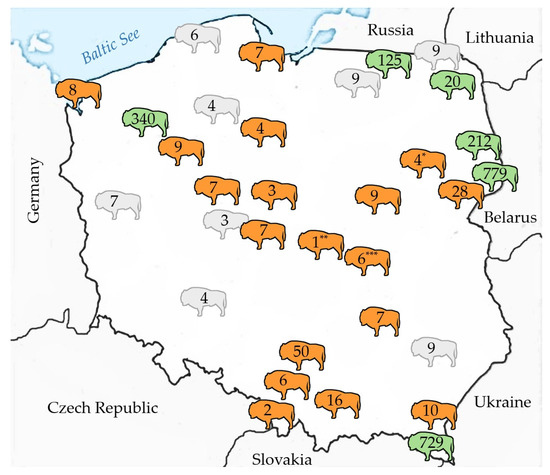 Distribution of European bison populations in Poland. The free-living and captive populations, which were included in the study, are marked in green and orange, respectively, while grey represents the remaining European bison herds from which no samples were available. The size of the population is marked as numbers of individuals registered in the latest edition of the European Bison Pedigree Book 1], except for non-existing herds from Kiermusy (* last data from 2020), ZOO Łódź (** 2016), and those depopulated due to tuberculosis in herds from Smardzewice (*** 2017).