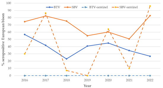 Seroprevalences (percentage of European bison with specific antibodies) to bluetongue virus (BTV) and Schmallenberg virus (SBV) in all animals and in the sentinel group (94 calves between 6 months and 1 year of age, deprived of maternal antibodies). BTV seroprevalences referred to the populations of the eastern part of Poland (Białowieska, Borecka, and Knyszyńska Forests, Bieszczady and Kiermusy), where BTV infections were present (N of European bison = 372) as well as the Schmallenberg virus (SBV) in all the populations within the surveillance (N = 600), between 2016 and 2022.