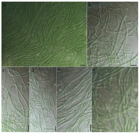 Light micrographs of Stenomitos nagquensis sp. nov. from the strain CSML-F035: (a) Parallel trichomes; isodiametric cells. (b–f) Detail of trichomes with varying shapes of apical cells; some trichomes also showing clear constrictions at the cross-walls. (S) Sheaths; (N) necridia; (A) apical cells; scale bar: 10 µm.