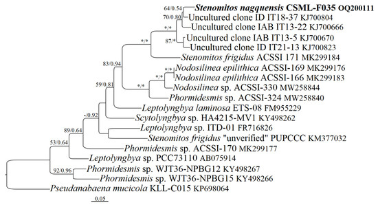 The distance matrix for the percentage similarity of the 16S rRNA gene sequences among strains of Stenomitos and CSML-F035 was determined after pairwise alignment and then viewed on the Distances panel (presented in %) in Geneious Prime. For the 16S–23S rRNA ITS region, similarity was estimated in MEGA v7.0.26 [44], where the p-distances were determined by calculating the sequence dissimilarity based on the formula (1 − p) × 100. Finally, the name for CSML-F035 was established and proposed as Stenomitos nagquensis according to the International Code of Nomenclature for Algae, Fungi, and Plants.