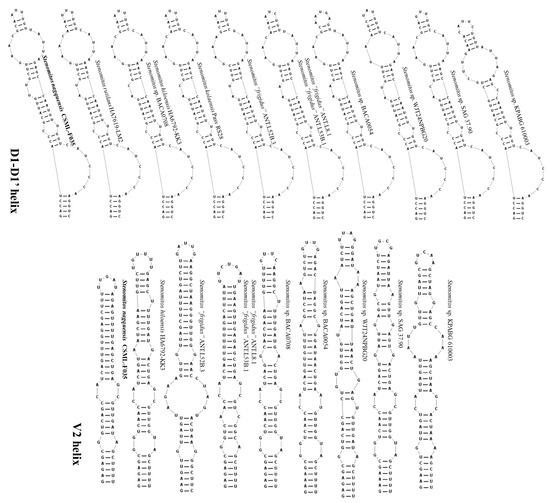 Predicted secondary structures of the D1–D1′ and V2 helices of the 16S–23S ITS region of strains of Stenomitos. The novel strain is labelled in bold.