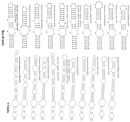 Predicted secondary structures of Box-B and V3 helices of the 16S–23S ITS region of strains of Stenomitos. The novel species is labelled in bold.
