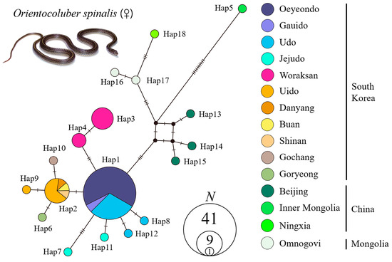 Median-joining haplotype network of 18 concatenated mitochondrial DNA (Cytb + ND4; 1809 bp) haplotypes of 15 Orientocoluber spinalis populations from South Korea, China, and Mongolia. The sizes of nodes (circles) are proportional to the number of individuals. Black dots represent median vectors inferred and unsampled haplotypes. Mutation steps between two haplotypes were indicated by diagonals.