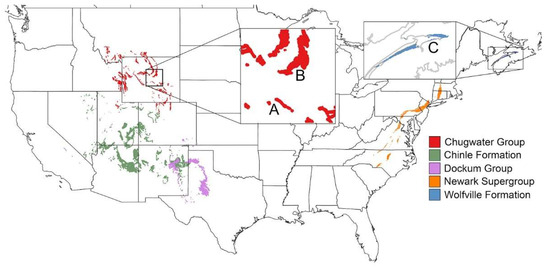 Exposures of continental Triassic strata across the contiguous United States and southern Canada. A = Cottonwood Creek (Alcova, WY); B = Hole in the Wall (Red Wall); C = Noels Head, Hants County, Nova Scotia [29].