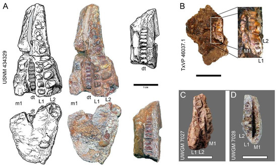 Referred Specimens: UWGM 7027, fragment of a right maxilla; UWGM 7028, fragment of a right maxilla; TxVP 46037.1, fragment of a left maxilla.