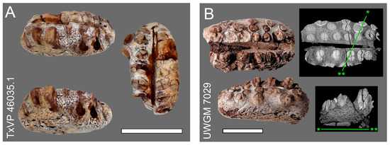Hyperodapedontinae indet. Isolated maxillae (A) labial or lingual view (top left), occlusal view (right), and labial or lingual view (bottom left) of isolated partial maxilla TMM 46035.1. (B) occlusal view (top), labial or lingual view (bottom left), section through occlusal surface in occlusal view (upper left), and transverse section (bottom right) isolated partial maxilla UWGM 7029. Scale bars = 1 cm.
