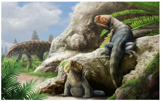 - Benton, M.J. The Triassic Reptile Hyperodapedon from Elgin: Functional Morphology and Relationships. Philos. Trans. R. Soc. Lond. B Biol. Sci. 1983, 302, 605–718. [Google Scholar] [CrossRef]