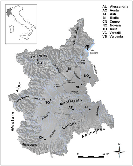 The geography of the PAV region is mountainous for about half (49.7%) of its extension, whereas the remaining part includes hills (26.9%) and plains (23.4%). From a biogeographical point of view, the PAV region encompasses two main biogeographical regions, Alpine and Continental, with a limited extension of the Mediterranean region in the Southeastern part along the Apennines, and the Aosta Valley region falling entirely in the Alpine region [24,25,26].