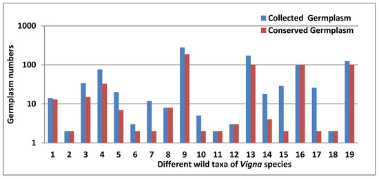 Wild taxa of the Vigna germplasm collected and conserved in INGB (1976–2021) based on a log scale with a base of 10. 1—Vigna angularis var. nipponensis, 2—V. adenantha, 3—V. bourneae, 4—V. dalzelliana, 5—V. hainiana, 6—V. glabrescens, 7—V. khandalensis, 8—V. marina, 9—V. sublobata, 10—V. minima, 11—V. luteola, 12—V. nepalensis, 13—V. trilobata, 14—V. reflexopilosa, 15—V. silvestris, 16—V. stipulacea, 17—V. trinervia, 18—V. vexillata, 19—V. wightii.