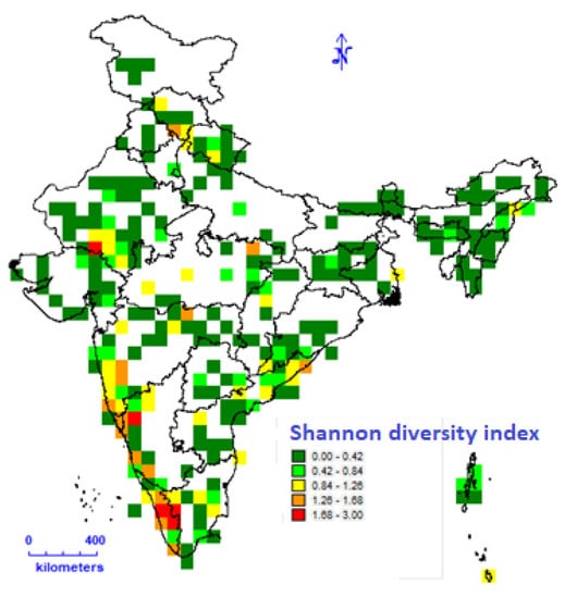 DIVA-GIS tools have been widely used for the ecogeographic mapping of collection sites, the diversity distribution of crops, and wild species. This software consists of a geographic projection system and WGS84 geodetic systems (datum) for linking the locations of sampled regions on the map. The GIS-based grid mapping technique has been used to identify diversity-rich areas, conduct a variability assessment, and determine the occurrence of the trait-specific germplasm [16]. A grid of definite size is assigned on the map to the points representing the collected germplasm. The grid size depends on the size of the geographical area (district/state/region). At the country level (large geographical area), the grid is 1° × 1° (111.321 × 111.321 km) in size, while for states/subdivisions (smaller area) a grid of 0.2° × 0.2° to 0.9° × 0.9° is used, depending upon the area and diversity [18]. To determine the spatial distribution and assess the species richness, DIVA-GIS is used for point data conversion into a grid analysis using simple circular neighborhood methods [16], and the diversity is calculated using the Shannon–Weaver diversity index [30] through the following formula: