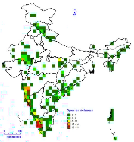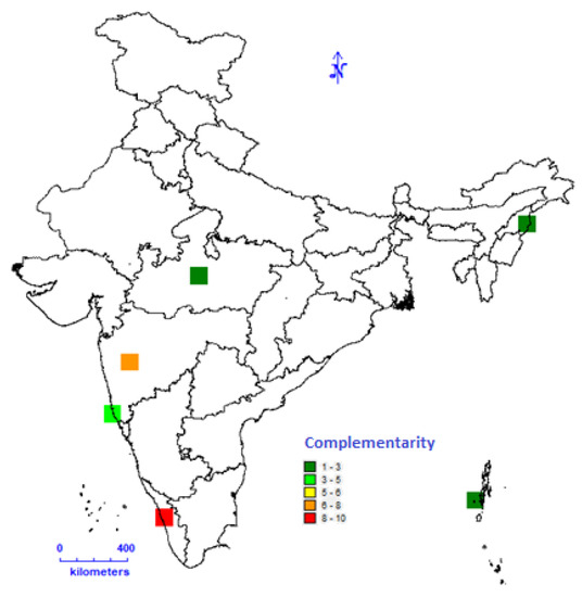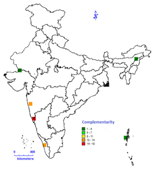 Based on the species richness and complementarity procedure, grid maps were generated for all 34 taxa of wild Vigna species reported in India. The available data showed that the wild taxa of Vigna species are distributed from the Northwestern Himalayas to the Eastern Himalayas and the Western Plain (Rajasthan) to the Western Ghats and A&N Islands. However, the highest species concentration is found in the WGR (Gujarat, Kerala, Goa, Karnataka, Maharashtra, Rajasthan, and Tamil Nadu). The complementarity analysis for all wild Vigna species showed that the major diversity-rich pockets are found in the western and southern parts of Maharashtra and central Kerala, with 14–18 taxa (Figure 4 and Figure 5). Following the complementarity procedure for all wild Vigna species, diversity-rich hotspots were identified in different states, such as Kerala (parts of Ernakulam, Malappuram, Palakkad, and Thrissur districts), Goa (north Goa district), Maharashtra (parts of southern Kolhapur and Sindhudurg districts), Karnataka (southern parts of Belagavi district and northern parts of Uttar Kannada district), Gujarat (northern parts of Banaskantha and Kutchh districts), Rajasthan (southern parts of Barmer and Jalore districts), Nagaland (Kiphire, Noklak and Phek districts), and the A & N Islands (North and Middle Andaman districts). These diversity-rich areas require immediate attention to protect hot spots as well as to collect accessions from these areas for ex-situ conservation.