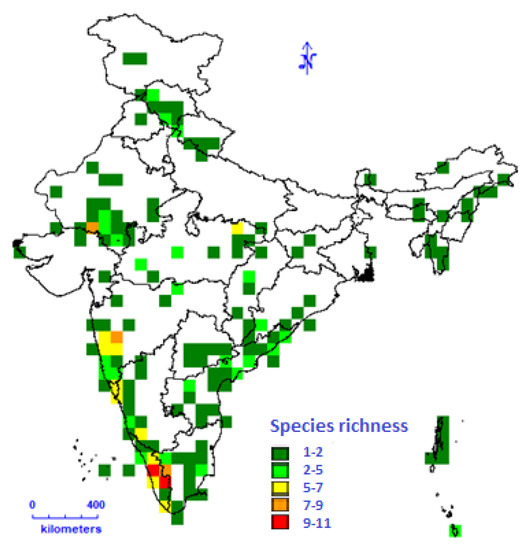 More than 460 thousand accessions of plant genetic resources are conserved in India’s national genebank housed at ICAR-National Bureau of Plant Genetic Resources, New Delhi (ICAR-NBPGR), with about 40 thousand CWR accessions. There are 928 Vigna CWR accessions belonging to V. sublobata (279), V. trilobata (172), V. vexillata (125), V. stipulacea (100), V. dalzelliana (76), V. bourneae (Gamble) Tateishi & Maxted (34) and V. silvestris (Lukoki, Marechal & Otoul) Aitawade, K.V. Bhat & S.R. Yadav (29), V. ternervia (26), V. hainiana (20), V. reflexopilosa (18), V. angularis var. nipponensis (14), V. khandalensis (13), V. marina (5), V. glabrescens and V. nepalensis (3 each), V. luteola (Jacq.) Benth (2), V. adenantha and V. vexillata var. wightii (Benth. ex Bedd.) Babu & S.K. Sharma (one each) [28]. These Vigna CWR accessions were collected from 24 states of India, showing a wide genetic base of the wild Vigna species in India (Figure 1). Information on the conserved germplasm accessions (i.e., the crop name, IC number, local name, collector number, collector name, location data, etc.) is usually documented in a passport database. The location is usually specified by the country, state, and at least one administrative subdivision (e.g., district) and by a description of the locality (village or panchayat name) from where the accessions were collected. The majority of the germplasm collection data contain area information (village/block/tehsil/district/state) and geocoordinates (lat. and long.) recorded by a global positioning system. Gaps in the collection site coordinates were filled by information from secondary sources (gazetteer, Survey of India map, etc.) and subsequently used in georeferencing and diversity distribution mapping. Herbarium specimens (491 specimens of different wild Vigna species) were also consulted for recording additional collection site information [29], which was then utilized in a complementarity analysis.