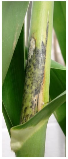 Late symptoms (i.e., black streaks inside leaf sheath of A. donax) of attacks by L. donacis.