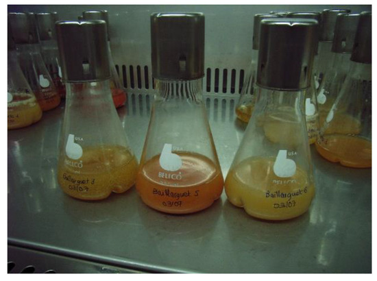 One agar slant of 1 cm2 from each single spore culture was transferred aseptically into 250 mL Erlenmeyer Flasks containing 100 mL of 24 g/L Potato Dextrose Yeast Extract Broth (PDB). The flasks were incubated on a rotary shaker at 150 rpm, 25 °C for 3–4 days (Figure 3).