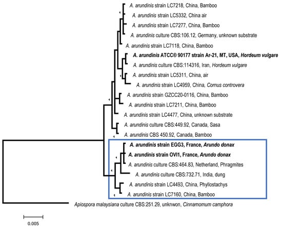 Fungal conidiae collected from ovipositors and ovarioles of L. donacis yielded cultivable colonies, and only one colony per ovariole or ovipositor. Conidiae associated with ovipositors and ovarioles were found to belong to two MOTUs. One (MOTU 6) was previously evidenced from the scrapings, i.e., F. proliferatum (Matsush.) Nirenberg found in females collected in Crete, and a new one was found in females collected in France, MOTU 23, i.e., Arthrinum arundinis which has been recently synonymized with Apiospora arundinis (Corda) Pintos and P. Alvarado comb. nov. [44] (Table 1 and Table S2). Arthrinium arundinis and its synonyms have been reported in 74 different plant hosts [47] and are commonly occurring in different habitats or biotopes [47,48]. A phylogeny of a combined ITS, TUB2, and TEF1 dataset between the MOTU 23, the American ATCC strain Ar-21 used in host range testing in Texas [6], and all A. arundinis retrieved from GenBank is presented in Figure 4. The phylogeny placed the MOTU 23 within a well-supported clade which included also A. arundinis cultures from Poaceae (CBS 464.83, which originated from dead culms of Phragmites australis in Netherland [47] and LC4493 and LC 7160 which originated from bamboo leaf in China) [49] (Figure 4). Sequences of the American ATCC strain Ar-21 were found similar to those of the CBS strain 114316 also isolated from Hordeum vulgare, but in Iran, and both strains clustered in the other well-supported clade.