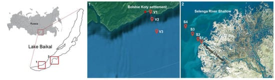 Sampling sites near the village of Bolshiye Koty, Varnachka area (V1, V2 and V3), and in the area where the Selenga River flows into the lake (Kharauz Channel) (S1, S2, S3 and S4).