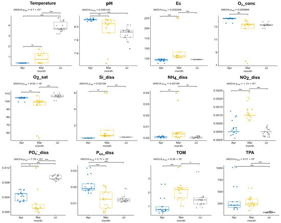 We observed significant differences in the physicochemical parameters of water, depending on the sampling area and season (Figure 2; Table 1). Water temperature was one of the significant seasonal factors. During the ice period, near the Bolshie Koty settlement, the largest values of pH and a high oxygen concentration (from 13.55 mg/L to 14.35 mg/L) were noted. Concentrations of dissolved Si, NH4+, NO2, TOM and Ec were higher at the Selenga Shallow compared to Varnachka in both seasons (Figure 2). The highest concentration of the dissolved Si was at the river mouth (6.02 mg/L) (Table S1); this parameter was only between 0.64 and 1.02 mg/L in the water column of Lake Baikal. Concentrations of biogenic elements in Baikal water at the Selenga Shallow were mostly lower than in the river. In July 2018, the spread of mixed cold water was shown. At that time, the hydrochemical parameters were similar between all stations (Figure S2; Table S1). The low temperature (3.2–4.7 °C) and elevated concentrations of nitrate nitrogen and phosphates indicated the influx of deep pelagic water into the coastal area. Ammonium and nitrites were not observed in summer.