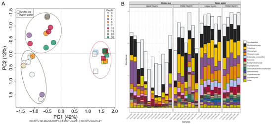 Microeukaryotic community composition of PA samples. PCoA of microeukaryotic communities. Glyph shape denotes under-ice (circle) and open-water (square) periods of community sampling. Glyphs are colored according to the depth at the sampling point. The under-ice samples of the upper layers circles are colored by the black oval, the under-ice samples of the deep layers are colored by the black dotted oval, and the summer samples circles are colored by the red oval (A). Hellinger-transformed relative abundances of the top-13 microeukaryotic phylotypes in PA communities. The bar stacks are arranged into four facets by two factor variables: “Layers“ and “Period”. The profiles are horizontally sorted by sampling site, month and sampling layer. Taxa presented in the color legend are sorted by total abundance in the decreasing order, except the last category, “Other”. The order of phylotypes in each bar is the same as in the color legend (B).