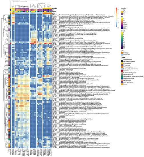 The taxonomic composition of microeukaryotes varied with season (Figure 4A). It was dominated by Dinoflagellata, Ciliophora and Diatomea during the ice cover period (Figure 4B). Moreover, depth-dependent changes in under-ice community composition could be observed (Figure 4B). The surface water communities formed a separate group, consisting of all 0-m depth profiles, with a couple of 4- and 5-m communities, which were dominated by Dinoflagellata, except the river mouth communities (Figure 4B). Indeed, PERMANOVA revealed significant differences for groups of microeukaryotic profiles using the two-factor “season”/“depth category” model (season: R2 = 0.42, p = 0.0024; conditional depth category: R2 = 0.12, p = 0.0024). Obviously, the similar composition of the microeukaryotic profiles in summer and clear separation of the sub-ice communities by the depth of sampling layer resulted in this effect. Heatmap analysis showed that the surface water communities (both at Selenga and the Varnachka area) were dominated by OTUs, whose sequences had the best match with sequences of Scrippsiella/Apocalathium (OTU4), Gymnodinium (OTU22) and OTU231, and OTU1 related to Dinophyceae (Figure 5; Table S3). Deeper waters (S3UI-10, S3UI-15, S4UI-20, V2UI-10, V3UI-5, V3UI-10 and V3UI-30) were mostly inhabited by a diverse group, with the best match with sequences of diatoms Ulnaria (OTU6), Fragilaria (OTU32), Discostella/Thalassiosira (OTU31), Nitzschia (OTU213); and dinoflagellates Gyrodinium (OTU9), group of OTU related to Ciliophora (Figure 4B and Figure 5). S4UI-30 was dominated by diatom Aulacoseira islandica (OTU30). The river mouth samples (S1UI-0, S1UI-4) were exceptions to this trend. The green alga Tetracystis/Chlamydomonas (OTU12), diatoms Diatoma (OTU17), Nitzschia (OTU8, OTU11) and Discostella/Thalassiosira (OTU31); Chytridiomycetes (OTU99) and Chrysophyceae (OTU39) prevailed in these samples. In contrast, no depth-dependent change was observed in summer (Figure 4). All summer communities were dominated by Chlorophyta, Dinoflagellata, Diatomea, Ciliophora and Chrysophyceae (Figure 4B). The most abundant OTUs belonged to Gyrodinium (OTU9), Discostella/Thalassiosira (OTU31), Peridiniphycidae (OTU21), Choreotrichia (OTU20) and Ulnaria (OTU6). Littoral communities (V1, V2) were dominated by Ulotrix zonata (OTU16). Microscopy data confirmed the relationship between the microalgae composition and depth (Figure S2).