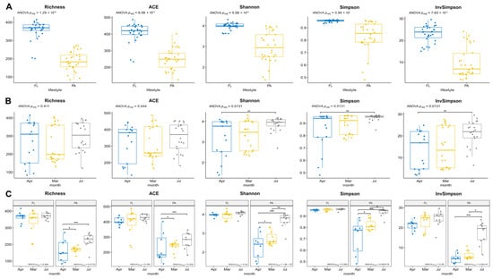 Alpha richness and diversity indices in bacterial communities. Comparison of FL and PA communities (A); communities of different seasons (B); FL and PA communities in different seasons (C). Significance code of Tukey’s post hoc tests: *** ≤ 0.001; 0.001 ≤ ** ≤ 0.01; 0.01 ≤ * ≤ 0.05.