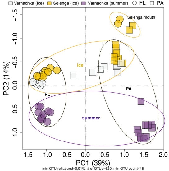 PCoA of FL and PA communities. The yellow oval circles present the communities of the ice-covered period, the yellow dotted oval shows the communities of the Selenga mouth; summer communities are circled in purple oval; community FL is in black oval; community PA is in black dotted oval.