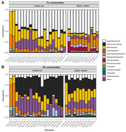 FL bacterial communities were relatively stable for the entire period of study, with a major contribution of an actinobacterial CL500-29 marine group. Actinobacteriota can comprise up to 50% of the bacterial community in upper layers of freshwater bodies [88,89]. The majority of known freshwater actinobacteria have been found in free-living bacterioplankton [19]. During the ice cover period, a large amount of Bacteroidota (mostly genus Flavobacterium) can be observed. It is a typical member of winter bacterioplankton [42,90,91].