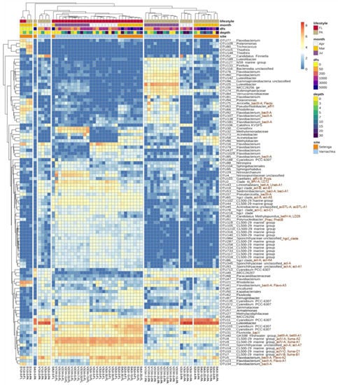 During the ice cover period, the near-surface PA communities contained a large amount of Flavobacterium. Microeukaryotic communities were dominated by dinoflagellate Gymnodinium baicalense at these time points. Flavobacterium is known to have an algicidal effect through either direct or indirect attack of target algal cells, including Dinophyceae [107]. During summer, Flavobacterium was dominant at all depths; curiously, OTUs responsible for this dominance were either rare or completely absent in ice cover period PA and all FL communities, suggesting a narrow specialization.