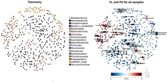 Bacterial co-occurrence networks were constructed for 494 OTUs (Figure 10). The resulting graphs showed that bacteria were clustering in accordance with their taxonomy. In other words, highly interconnected large subgraphs were likely to consist of taxonomically related bacteria (Figure 10 left). There was also a good mapping between interconnected subgraphs and FL/PA differential abundance contrast. The FL subgraphs were larger, including more OTUs than the PA subgraphs (Figure 10 right). Taxonomically, they mostly consisted of Actinobacteriota. The PA communities also had a mixed-taxonomy subgraph that included mostly members of the phyla Bacteroidota and Verrucomicrobiota. Further, there were FL-specific subgraphs of Bacteroidota OTUs. Further yet, some Actinobacteriota OTUs were more common in the PA communities. Abundant OTUs related to Cyanobium, and a group of OTUs related to Phycisphaeraceae (phylum Planctomycetota), belonged to the PA samples, as well.