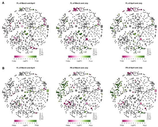 Co-occurrence networks of FL and PA communities. Differential abundance (DA) of community profiles colored by month log2FC in FL in March and April; in March and July; in April and July (A); and in PA in March and April; in March and July; in April and July (B). The graph layout is preserved. The size of vertex in DA-graphs is proportional to mean OTU abundance.