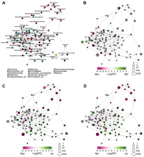 Co-occurrence networks of microeukaryotic communities. Graph layout colored by taxonomic assignment of OTUs at the phylum level (A); pairwise differential abundance of community profiles by month of sampling: March vs. April (B); March vs. July (C); April vs. July (D). The graph layout is preserved. The size of vertex in DA-graphs is proportional to mean OTU abundance.