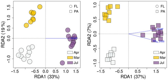 Redundancy analysis showed that, for the FL bacterial profiles, temperature was the only significant variable (p = 0.001); for the PA bacterial communities, the model included temperature and dissolved PO43− concentration (p = 0.001) (Figure 13). These factors were directly linked to seasonality: summer brought both the temperature increment and the increased phosphate availability (as dissolved and particulate organic matter started to mineralize). The backward elimination strategy yielded similar results, with the temperature as the only significant variable for FL (R2 = 0.30, p = 0.002), and temperature (R2 = 0.33, p = 0.002), PO43− concentration (R2 = 0.39, p = 0.002) and TMA (R2 = 0.41, p = 0.026) for FL communities.