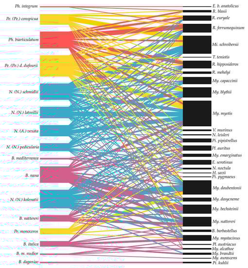 Moreover, apart from the epidemiological perspective, the study of host–parasite interactions is an opportunity to understand the ecological relationships between organisms. Parasites, together with their hosts, constitute an ideal system for investigating the patterns and mechanisms of community structure and dynamics [38]. Analyses of the relations between parasites and hosts are possible using so-called ecological network analysis, which is a representation of interactions within the studied ecosystems [39,40,41]. Ecological networks can inform us about the evolutionary and ecological processes that generate and shape biodiversity. The structure of ecological networks can also provide information on the vulnerability of ecological communities to various kinds of disturbances: from climate change to the illegal hunting of keystone species and extinctions of species-to-species invasions [42], or they can help to better understand the phoretic relationships between arthropods [43]. Ecological networks and host–parasite associations remain understudied in bats and their parasites, including nycteribiids. Despite growing knowledge on diversity and bat-Nycteribiidae associations [35,38,44,45,46,47,48,49,50] and the existence of literary records on the host species of bat flies from Europe [7,51,52], many gaps need to be filled.