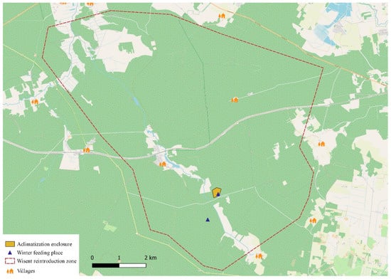 An area of approximately 60 km2 was available for the dispersal of the European bison (Figure 1). However, the area potentially available for European bison in this region is much larger, over 150 km2 of mostly forest area, without extensive development of human settlements. The reintroduction of the European bison herd in the Żednia Forest District was preceded by several years of preparation. A number of tasks were carried out to improve the food base of the species, access to water, and the possibility of feeding animals during the winter. Tens of hectares of mid-forest meadows have been re-established by being mown and returned to agricultural use, while haystacks and feeding racks have been built where hay collected from meadows is spread during the winter.